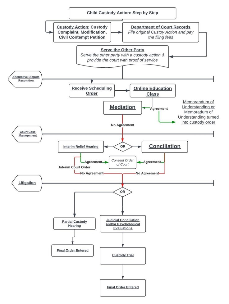 This guide explains the custody process from filing through final resolution. It follows the same flow as the court’s custody process chart and helps both self‑represented parties and attorneys understand what to expect.